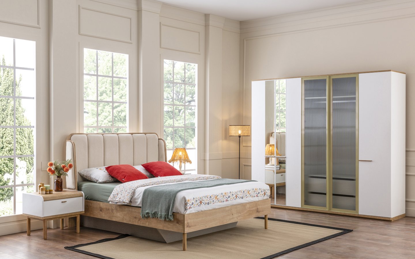 | Takım İçeriği | Yatak Odası takım içeriğinde 1 adet dolap, 1 adet başlıklı karyola, 2 adet komodin bulunmaktadır. |