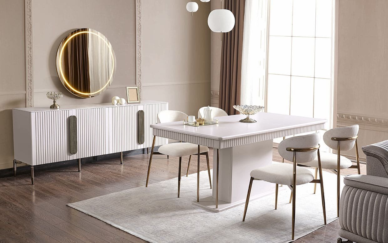 Takım İçeriği Yemek odası takım içeriği 1 adet konsol, 1 adet yemek masası ve 4 adet sandalye fiyatlandırmasıdır.